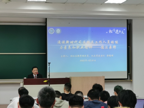 4月20日下午,由警务学院主办的“警务讲坛”第十七讲“漫谈新时代司法机关工作人员的能力素养和职业精神——德法兼修”在信教-106教室顺利举办。本次讲座由松江区人民法院党委成员、机关党委书记俞德明法官主讲,警务学院院长蔡一军教授主持,新利18官方客服一百余名师生参加。