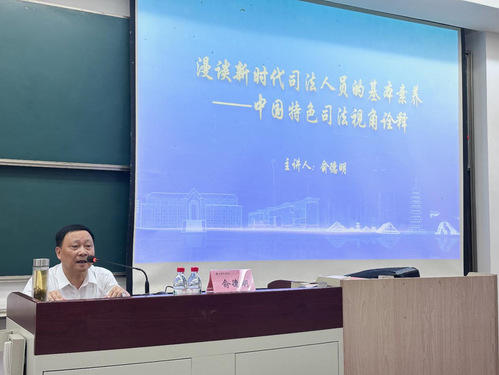 随后,俞德明教授从中国特色司法视角出发,对新时代司法人员的基本素养进行了具体解释:一是要以政治建设为统领,做忠诚铸魂的政治人,始终忠于祖国和人民,不忘初心,牢记使命;二是要着力提升法律专业能力,做明辨是非的法律人,他从法院构成、案件审理、日常办公三个方面举例,提醒在座学子要在学习中筑牢专业基础、刻苦学习专业知识,有意识地培养多问一句、多想一层、多做一点的“三多”意识和强化苦心人、用心人、有心人的“三心”能力;三是要严肃纪律规矩职业操守,做干净纯粹的社会人,新时代司法工作人员在工作中会遇到诸多难题、阻碍以及压力,对于即将步入司法领域的同学们来说,大学生活是塑造个人品格、提升综合素质的关键时期,要做到主动提升个人的道德素养,不断加强自身心理健康教育。