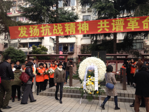 该遗址位于真如社区车站新村内,1932年1月28日,日寇悍然出兵进犯上海闸北,当时驻防淞沪地区的十九路军将士奋起抗战,爆发了震惊中外的“淞沪抗战”,淞沪抗战是中华民族抗击日本侵略者的伟大壮举,在我国抗日战争史上具有非常重要的意义。本次祭扫活动的主题是“民族魂永垂,十九路军不朽”,居民们以诗词朗诵,革命歌曲合唱,书法摄影等多种形式开展对革命先烈的纪念活动,继续教育学院(培训部)党员向烈士纪念碑默哀一分钟并敬献了鲜花。