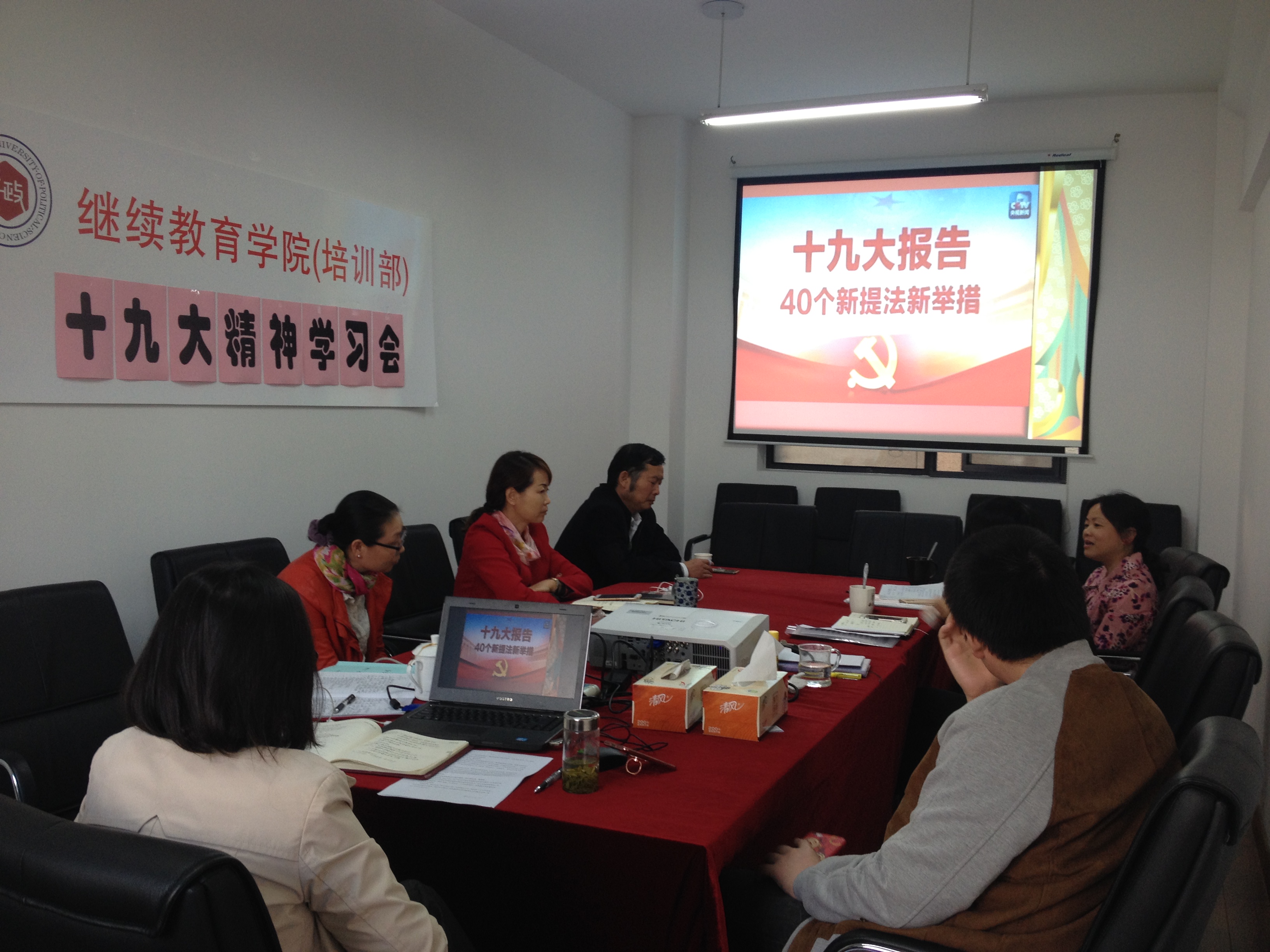 2017年11月2日,继续教育学院(培训部)党支部召开十九大精神学习会,学习会由支部书记程秀玲主持,采取支部书记上党课的形式,全体党员参加。本次学习的主题是《认真学习十九大报告精神 深刻领会习近平新时代中国特色社会主义思想》。