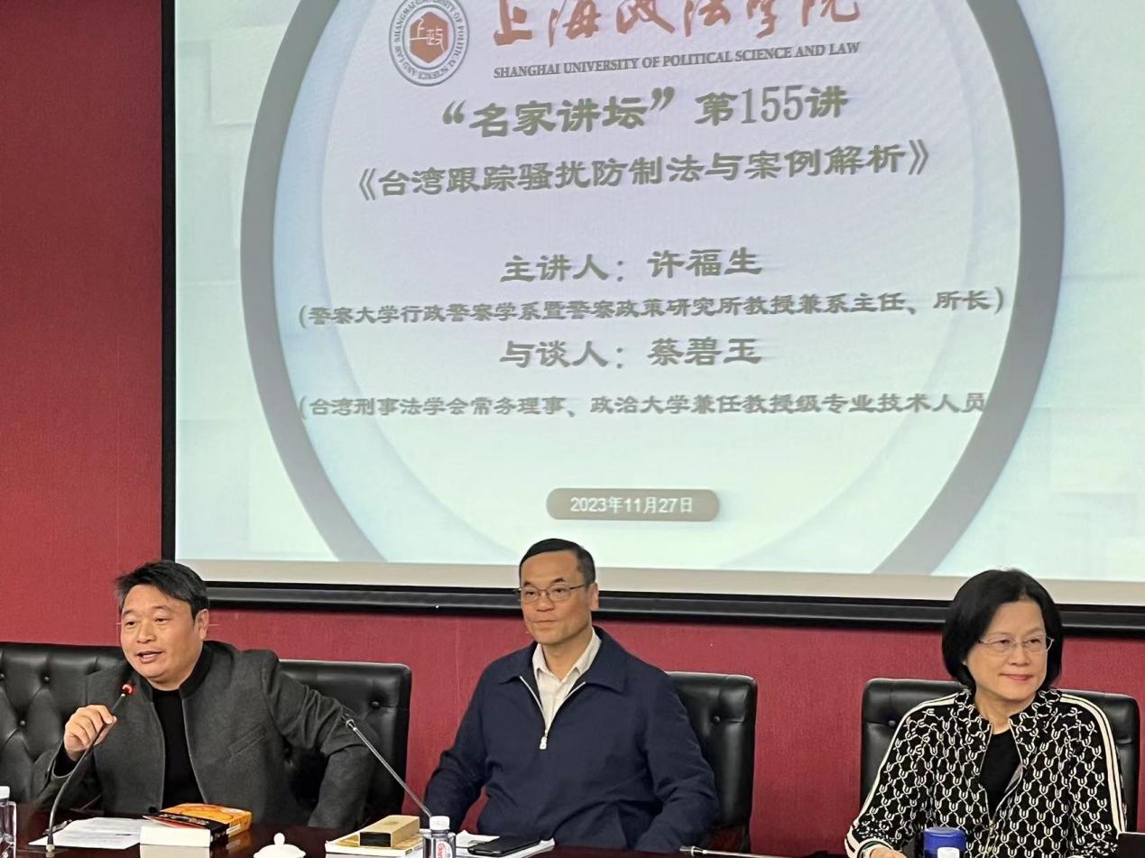 11月27日下午,新利18官方客服“名家讲坛”第155讲在汇知楼107顺利召开,警察大学行政警察学系暨警察政策研究所教授兼系主任、所长许福生教授应邀以“台湾跟踪骚扰防制法与案例解析”为题作了一场高水平的学术讲座,讲座邀请了台湾地区刑事法学会常务理事、政治大学兼任教授级专业技术人员蔡碧玉参与与谈。讲座由我校教务处处长赵运锋教授主持,我校百余名师生参加了本次讲座。