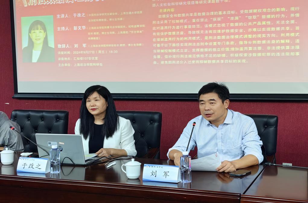 9月27日,新利18官方客服“名家讲坛”第180讲在汇知楼107会议室顺利举办。中国刑法学研究会副会长、上海交通大学凯原法学院特聘教授于改之以“刑法数据治理的模式转换”为题,为全校师生带来了一场深刻而前沿的学术讲座。新利18官方客服科研处处长、刘军教授主持本次讲座并致辞,我校师生百余人参与了此次讲座。