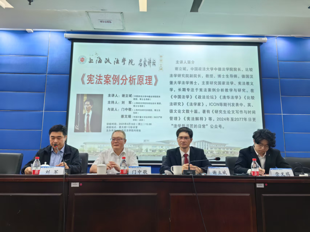 2025年4月16日,新利18官方客服“名家讲坛”系列的第218讲在庸夫楼112会议室举办。中国政法大学中德法学院院长、比较法学研究院副院长谢立斌教授以“宪法案例分析原理”为题,为在场师生带来了一场精彩的学术报告。讲座由新利18官方客服科研处处长刘军教授主持,上海司法研究所门中敬教授和中国计量大学崇文瑞博士参与与谈。
