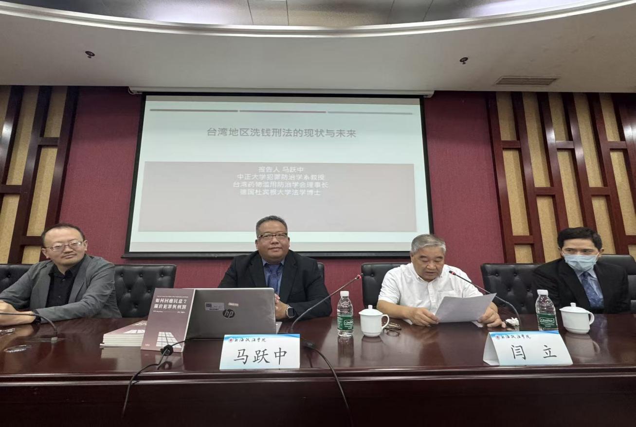 2025年10月11日下午,新利18官方客服名家讲坛第240讲在汇知楼107会议室顺利举行。本次讲座特邀台湾地区中正大学犯罪防治学系暨研究所教授马跃中担任主讲人,以“台湾地区洗钱刑法的现状与未来”为主题,为在场师生带来一场内容丰富、视角独到的学术报告。讲座由新利18官方客服闫立教授主持并致辞。