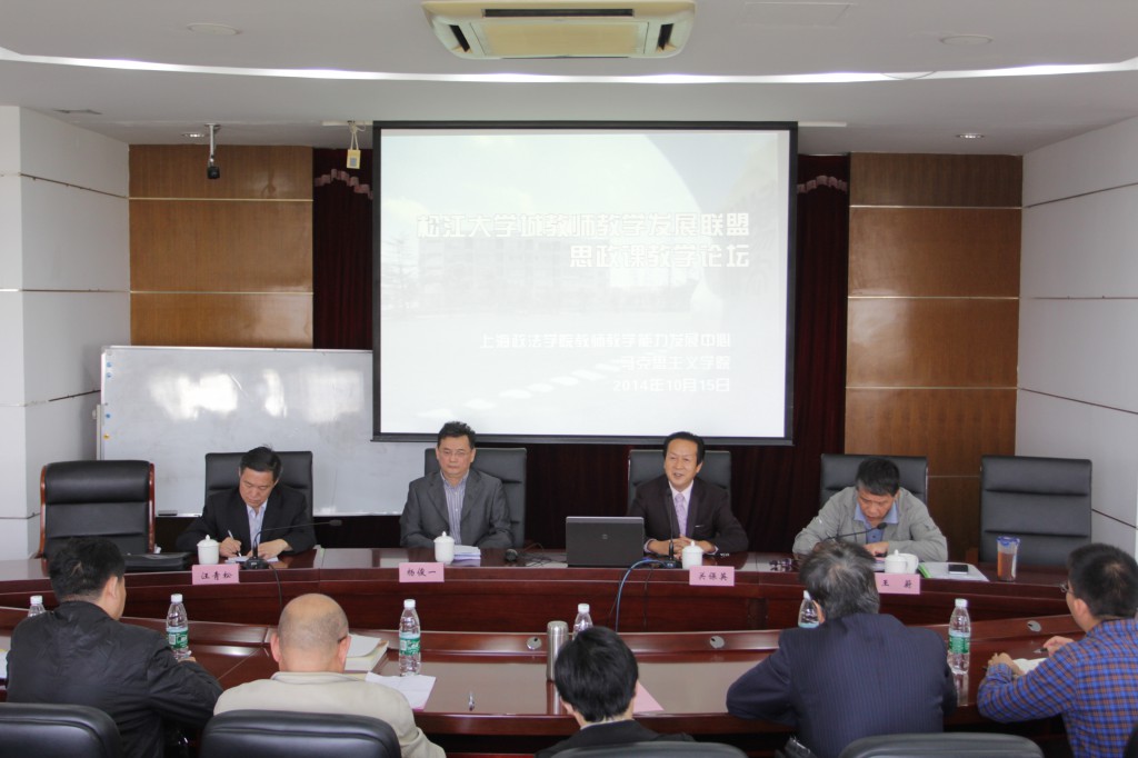 2014年10月15日上午九点,在我校行政楼视频会议室,成功召开“松江大学城教师教学发展联盟思政课教学论坛”会议。该论坛由新利18官方客服教师教学能力发展中心和马克思主义学院共同承办。我校党委书记杨俊一教授、副校长关保英教授出席会议。来自松江大学城7所高校的思政课专家学者与我校马克思主义学院的师生共同参会,会议由我校校长助理王蔚教授主持。