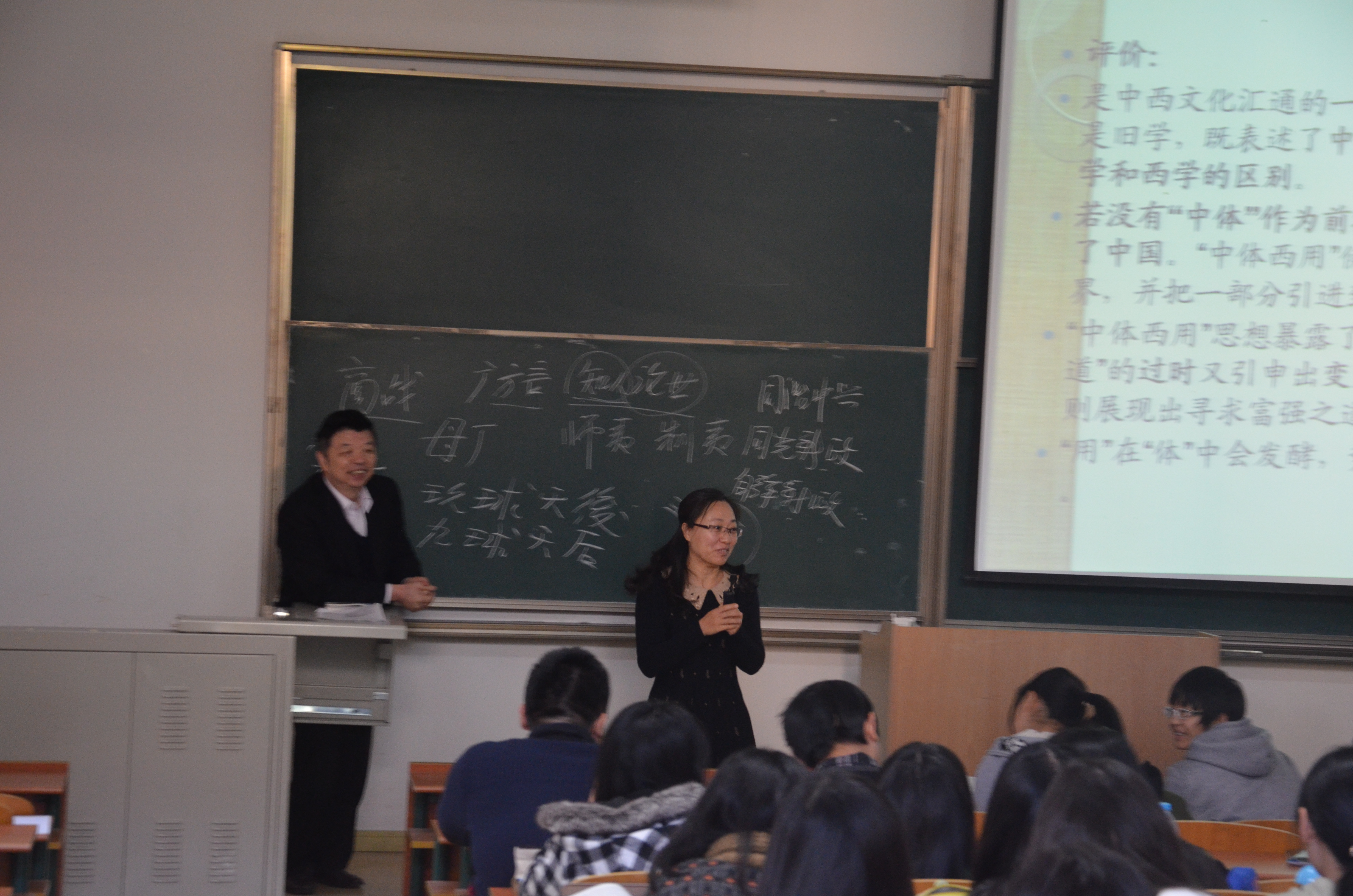 胡申生教授是知名社会学家,上海市高校思想政治理论课名师工作室——“胡申生工作室”负责人。2011年马克思主义学院四名教师与“胡申生工作室”结对,此后定期开展系列教学活动。这次教学活动选择的是《中国近现代史纲要》“专题四——办洋务与思想启蒙”的内容。课堂上,围绕“对洋务运动的反思”这一主题,胡申生教授联系现实,从六个方面做了深入浅出的分析。胡教授精彩的讲授不但让学生领略到思政理论的独特魅力,更激发起他们运用理论知识分析社会现实问题的极大兴趣。