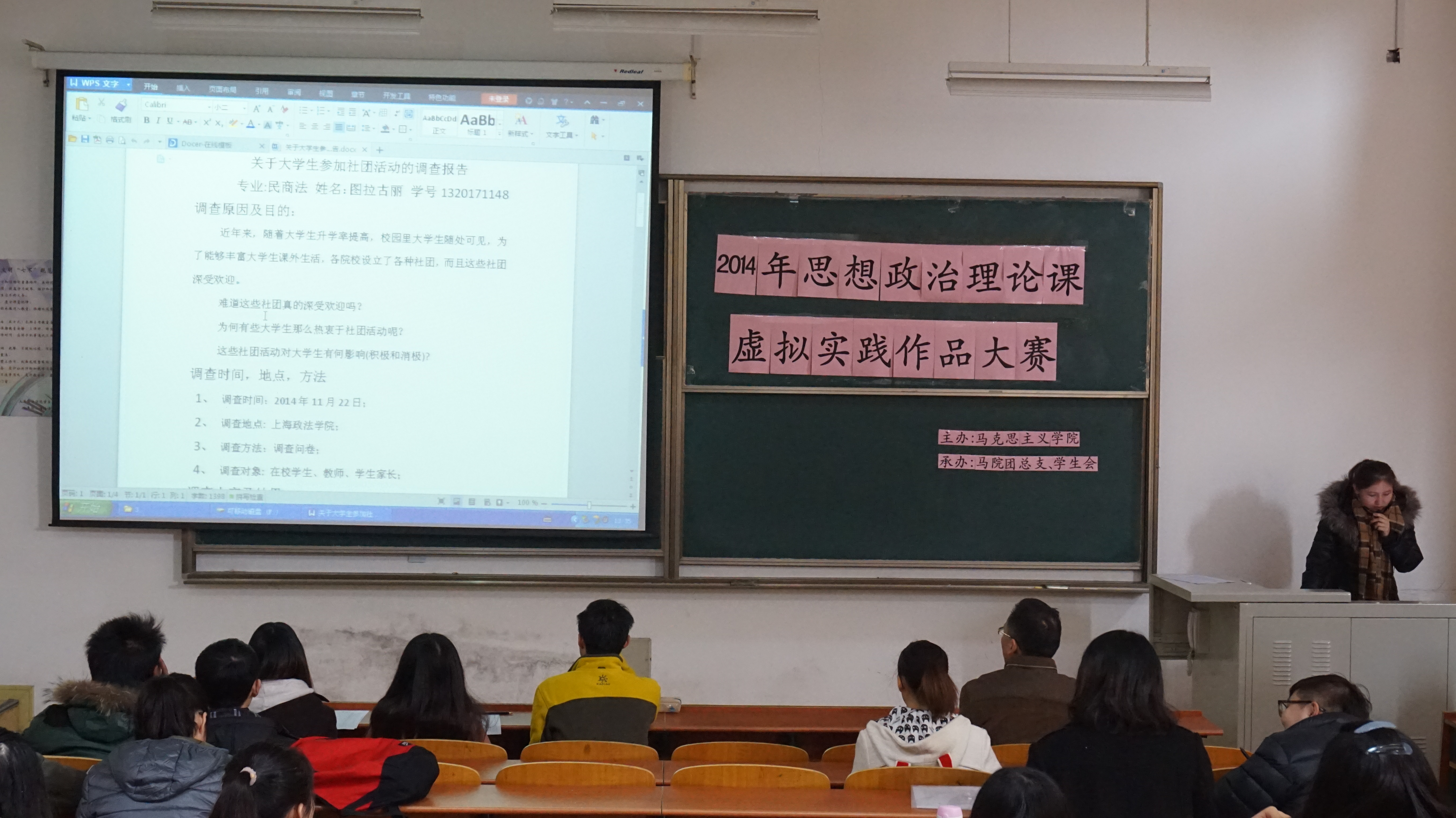 为培育和践行社会主义核心价值观,鼓励大学生用科学的世界观、方法论分析当下社会问题,马克思主义学院于12月9日下午在A8教学楼顺利举办2014年度思想政治理论课虚拟实践作品大赛决赛,来自全校各学院的230多名学生携143件作品参加了此次角逐。比赛分五个场地同时进行,将现场评委打分的基础上由组委会审核后,评选出一、二、三等奖和优秀奖。
