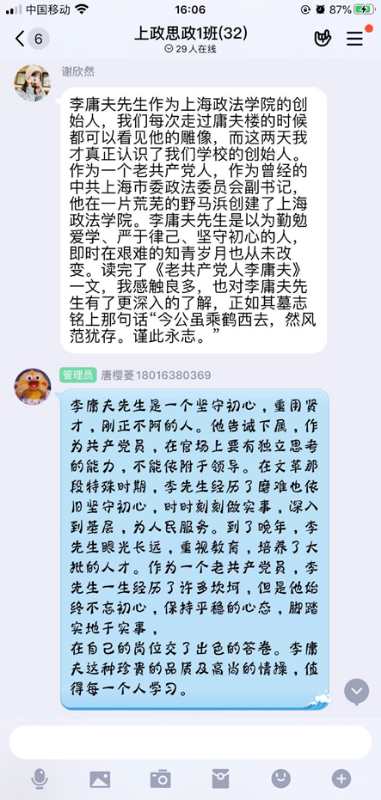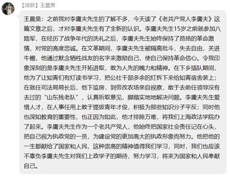 大二同学这样总结到:学四史,学习的是历史,培养的是爱国情怀,是对老一辈共产党人的敬佩与怀念。李庸夫先生,参与过革命,经历过批斗的老共产党人,在后来的工作中并没有怨恨,而是全心全意为党做事。他亲自参与上海市的拨乱反正,真刀实枪为受到冤屈的人平反。他行动力强,爱护百姓,听闻有残疾老人在一个农场里生活条件不好,当即前往慰问,并迅速解决他们的生活难题。他着力提拔有为青年,不拘一格降人才,为党和国家的事业做了突出的贡献。他重视法律教育,开办法律院校,培养法律人才,为当时以及之后的法治建设储备了人才资源。