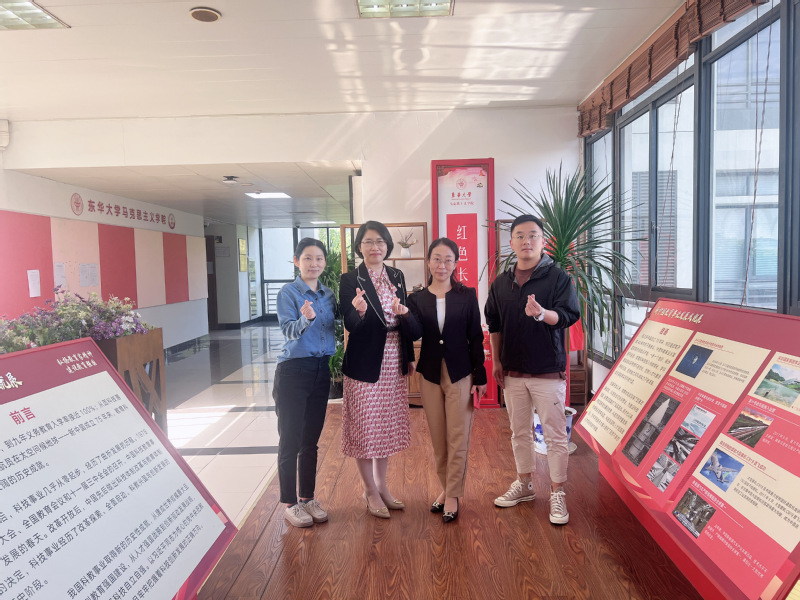 随后,在林惠英的带领下,参观了东华大学马克思主义学院的红色长廊及“新中国教育事业发展成就展”,通过历史照片和生动案例,深刻感受了新中国成立75周年来我国教育事业的辉煌成就和伟大变革。双方表示,此次交流学习收获颇丰,不仅加强了对彼此学院的了解,还学到了很多宝贵的经验和做法。双方一致认为,此次调研交流为两校、两院之间的合作和交流搭建了良好的平台,双方将继续保持密切联系,加强沟通与写作,共同推动两院的发展。