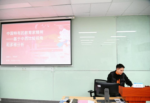 在收到上外马院的活动邀约后,上政马院高度重视,选派2024级硕士研究生齐英杰代表学院参与。齐英杰以《什么是“中国特有的教育家精神”——基于中西比较的视角和多维分析》为题作分享发言。他从价值取向与使命担当出发,系统阐释了中国教育家精神的独特内涵,引发在场师生的热烈讨论。齐英杰在讲演尾声真挚地说道:“非常感谢上外马院搭建的交流平台,让我有机会与各校师生深入探讨教育话题。这次经历不仅拓展了我的研究视野,也让我更加坚定了作为一名马克思主义理论学子的责任与使命。”