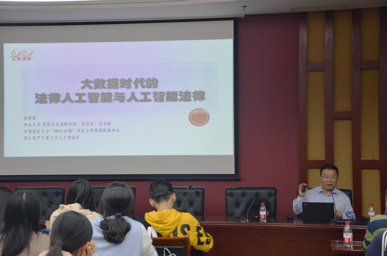 10月22日晚上,中山大学博士生导师熊明辉教授应邀来到我校综合研究中心107会议室作题为“大数据时代的法律人工智能与人工智能法律”学术报告。该报告系我校名家讲坛第35讲暨人工智能法学系列学术讲座第二讲。报告由人工智能法学院党总支书记欧阳为民教授主持,人工智能法学全体学生和部分其他专业学生踊跃参加,认真聆听了报告。