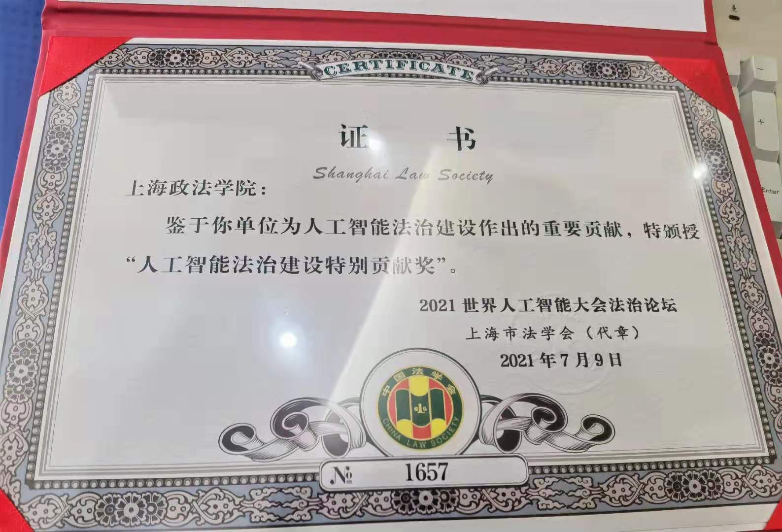 7月9日,以“智能社会的法治秩序”为主题的2021世界人工智能大会法治论坛在上海世博中心拉开帷幕。新利18官方客服连续3年深度参与协办大会法治论坛,两次承办法治青年论坛。此次,因法治建设的突出成就,新利18官方客服荣获由上海市法学会颁发的“人工智能法治建设特别贡献奖”。