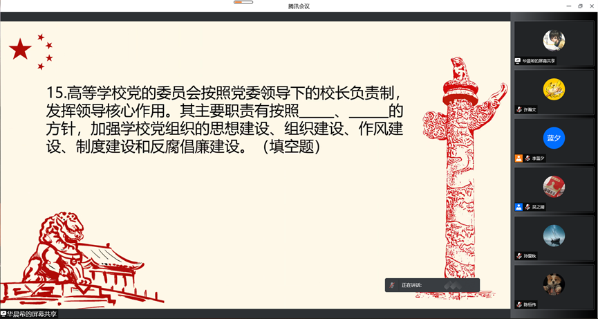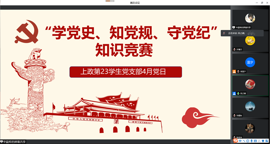 为深入学习贯彻习近平总书记关于依规治党的重要论述,推动党内法规学习往深里走、往实里走, 4月30日,上政第23学生党支部开展“学党史、知党规、守党纪”知识竞赛暨4月主题党日活动。