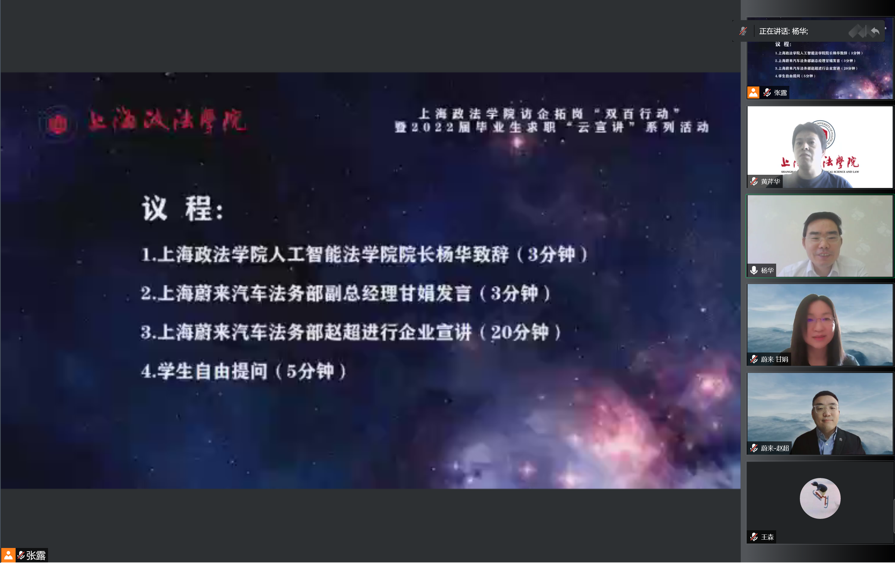 5月31日下午,由校学工部就业中心、人工智能法学院共同主办的访企拓岗促就业“双百行动”暨2022届毕业生求职“云宣讲”第五场顺利举行,邀请上海蔚来汽车法务部负责人进行主题宣讲。人工智能法学院院长杨华、党总支副书记彭辉、副院长黄芹华,学工部就业服务中心主任张宏辉出席。人工智能法学院全体本科生、研究生120余人参加宣讲。宣讲活动由学工部就业服务中心张露主持。