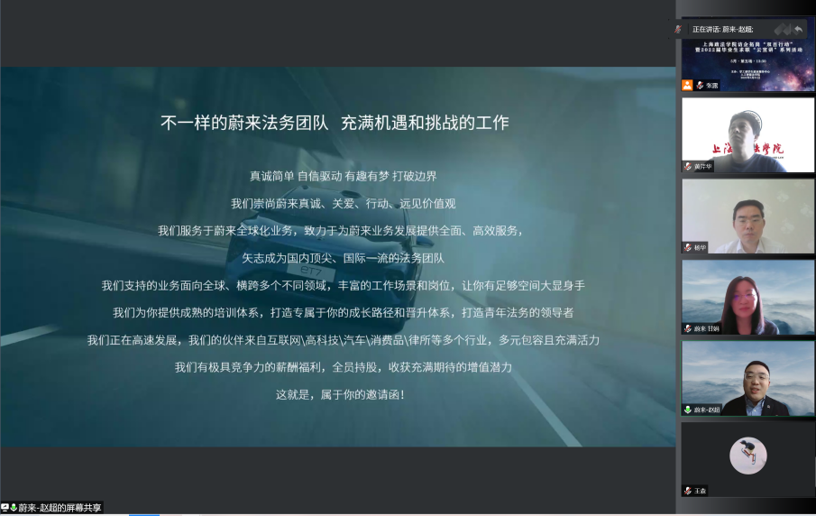 上海蔚来汽车法务部法律顾问、实习生负责人赵超向同学们详细介绍蔚来公司的业务情况、全球业务布局、法务部门情况以及目前招聘职位信息,鼓励符合条件、有意愿的同学投递简历。会上还就同学关心的问题进行了解答,气氛热烈。