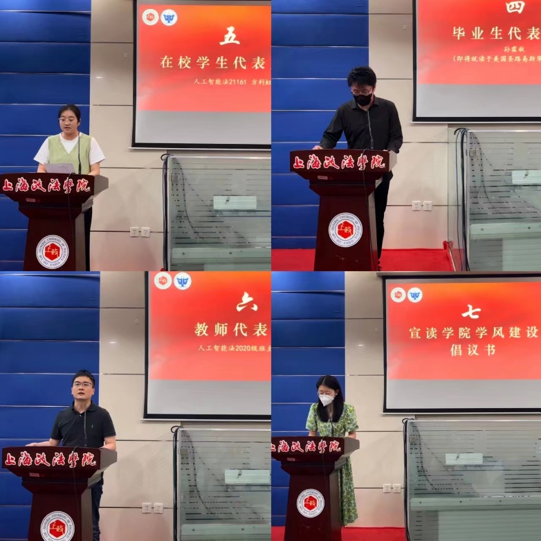 在交流分享环节,毕业生代表,即将赴美国圣路易斯华盛顿大学攻读硕士的孙霖秋回顾了本科四年的成长历程,鼓励在校同学将学习与实践紧密结合,做好个人发展规划与定位,为自己的目标奋斗努力;在校生代表方利虹在发言中结合自己的学习经验,对如何掌握科学的学习方法与培养积极心态提出建议;教师代表,智能法20161班主任吴惟予博士分享了自己对如何建设良好学风的体会,希望同学们找到学习意义、掌握正确方法、养成主动态度,他代表学院全体教师承诺,将始终围绕学生学习需求,以优良的教风带动学风,以良好的学风促进教风,形成师生互动、教学相长的生动局面。