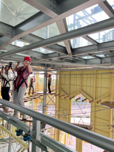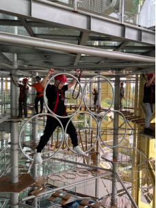 下午的“蜂巢塔高空探险”项目是集宇宙探索空间、高空探险、攀岩、飞拉达、滑筒、快跳、高空秋千等9大特色体验于一体的极限高空拓展项目,共有初、中、高不同难度超266个关卡探险。每个关卡都充满困难和挑战,所有人都尽可能地挑战了自我,彰显了学校新进教职工积极奋进、敢于拼搏、开拓进取的精神风貌和“不抛弃,不放弃”的团队信念。