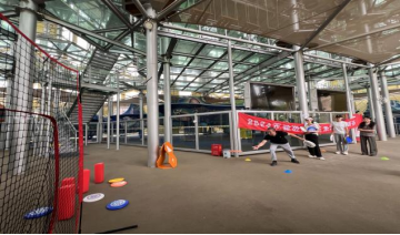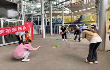 “互动飞盘”项目中包含四个小项目,分别是“飞盘投篮”“飞盘九宫格”“飞盘保龄球”“飞盘高尔夫”,需要每对队员依次完成四个项目累计积分。在这一项目中,每对队员认真练习,通过分享经验、技术交流等方式增进了彼此的了解和友谊。