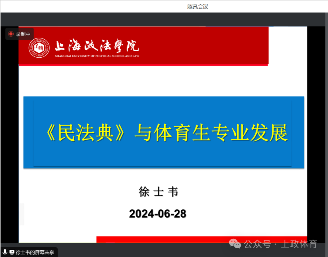 6月28日晚,体育法治研究院徐士韦教授应邀为上海体育大学学生开展主题为“《民法典》与体育生专业发展”的线上专题学术讲座。讲座内容由《民法典》及其历史意义、体育生专业发展及去向、《民法典》相关内容聚焦、新《体育法》带来的共性思考、新业态引领就业新去向五个部分组成。