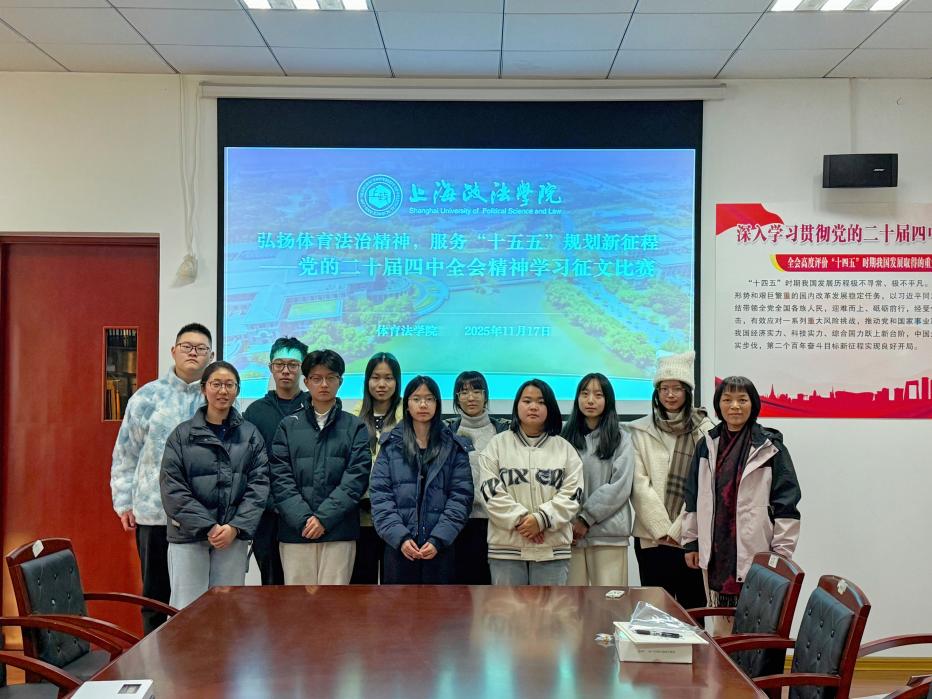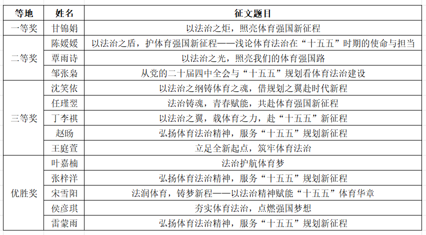 为深入学习贯彻党的二十届四中全会精神,全面落实《体育强国建设纲要》及“十五五”规划建议中的关于体育强国、健康中国以及法治建设的战略部署,推动体育法治与体育事业深度融合,实现高质量发展,体育法学院面向全院本科生组织发起了“弘扬体育法治精神,服务‘十五五’规划新征程”征文比赛。