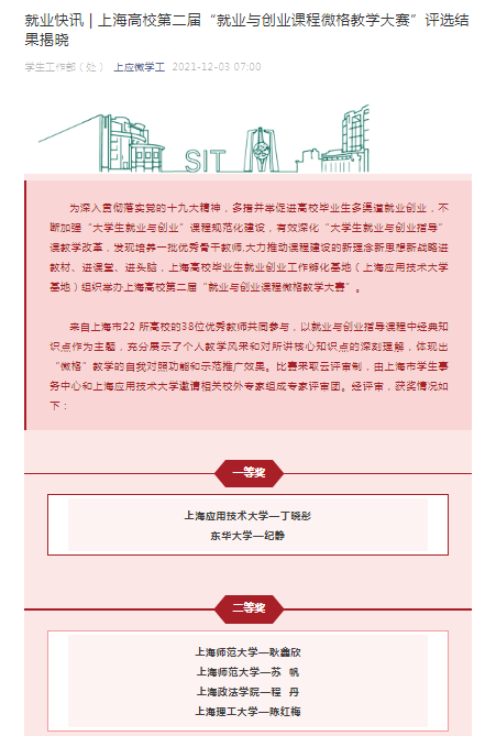 4.我校程丹老师获得上海高校第二届“就业与创业课程微格教学大赛”二等奖