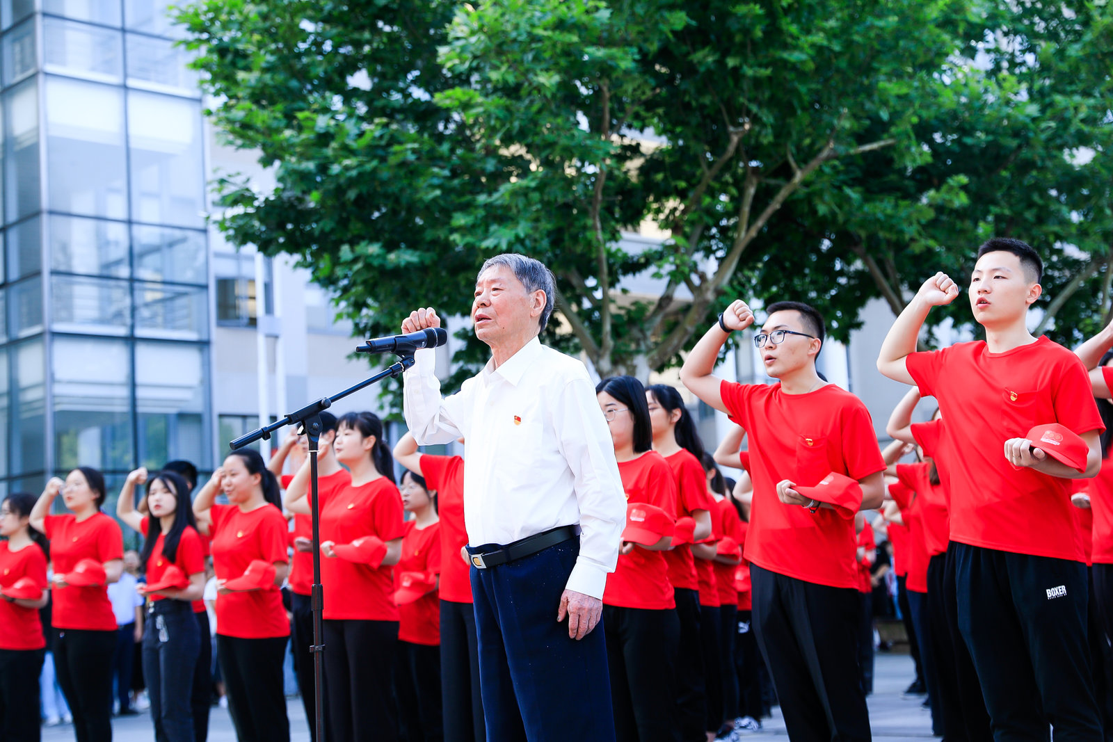 发挥老党员先锋模范作用,在2021年新党员入党宣誓仪式上,我校86岁的退休党员、“光荣在党50年”纪念章获得者茅家义带领90后、00后全体新党员宣誓。
