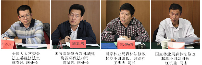 全国人大常委会法工委经济法室副处长施春风、干部李克锋;国务院法制办农林城建资源环保法制司副处长翁贤忠;国家林业局森林法修改起草小组组长、政法司司长王洪杰,副组长江机生,小组成员、政法司副处长张绍敏,小组成员赵东泉参加会议。研讨会开始后,王洪杰司长介绍了《森林法(修改征求意见稿)》的修改背景和主要考虑。