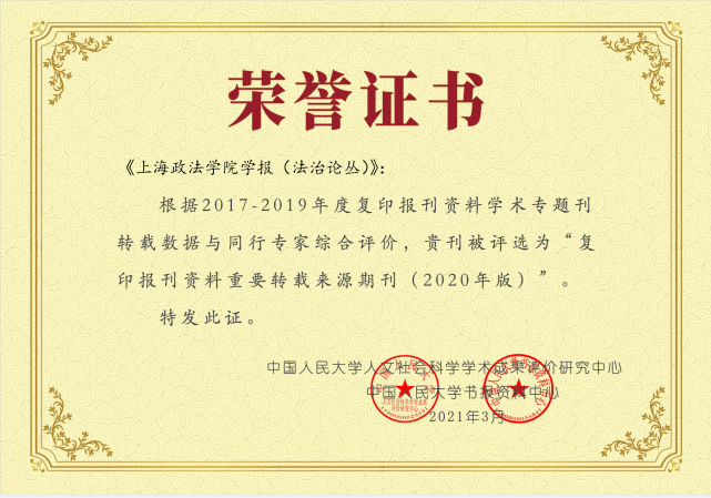 近日,在中国人民大学人文社会科学学术成果评价研究中心和中国人民大学书报资料中心发布的2020年度中国人民大学人文社科评价成果系列榜单中,《上海政法学院学报》入选《复印报刊资料重要转载来源期刊(2020年版)》。该榜单依据2017-2019年度复印报刊资料学术期刊的转载数据和同行定性评审结果,按21个学科划分,最终遴选出741种作为2020年版复印报刊资料重要转载来源期刊,其中期刊724种,集刊17种,法学类入选期刊50种。