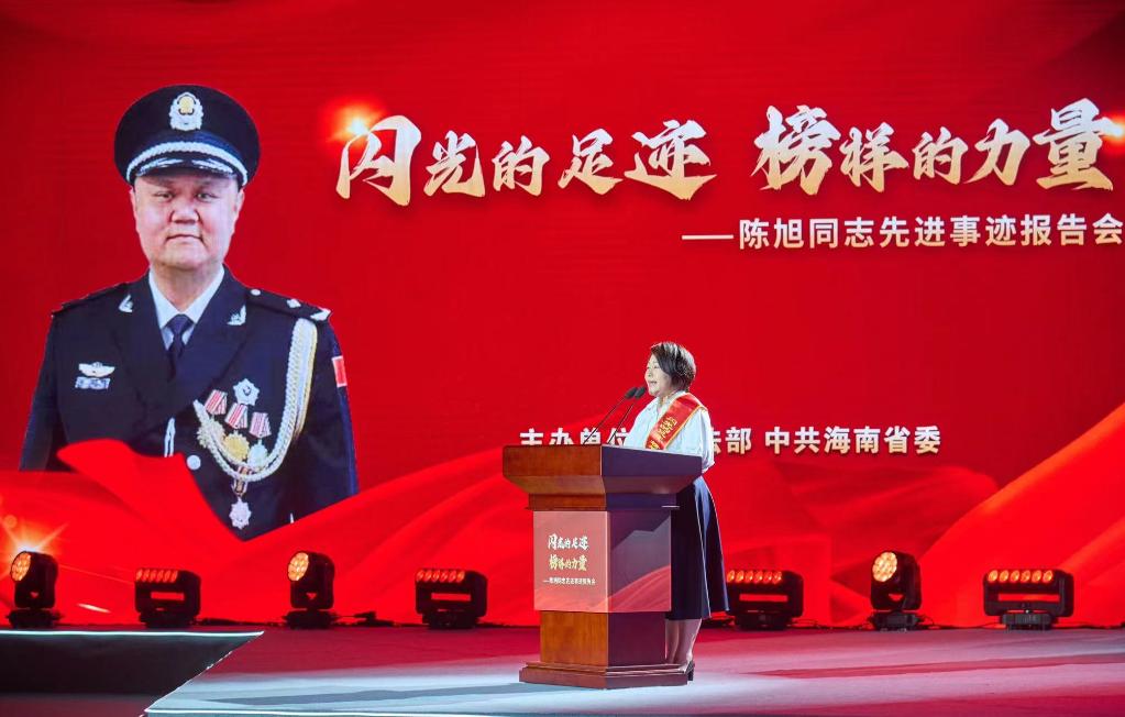 日前,陈旭妻子孙官梅在“陈旭同志先进事迹报告会”上进行宣讲。