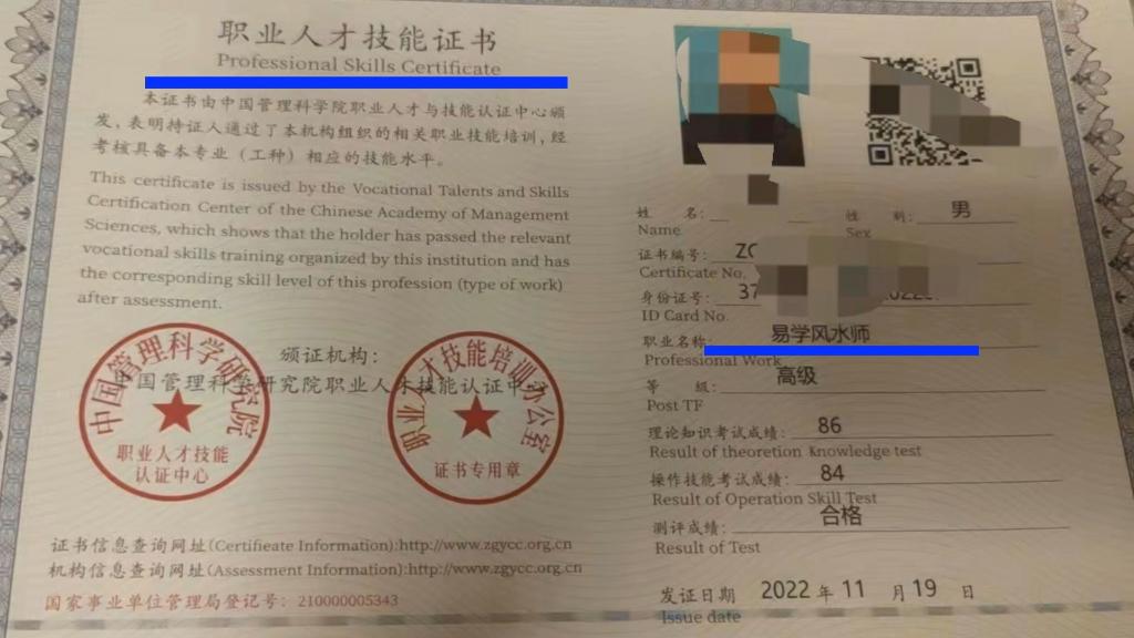 证书样张上面印着“职业人才技能证书”,职业名称为“易学风水师”。而在人社部最新修订的《中华人民共和国职业分类大典(2022年版)》中,并没有这一职业。