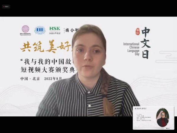 唐佳怡作为获奖者代表受邀在线上颁奖典礼上发言,感谢活动主办方让她有机会向大家分享自己与中国的美丽邂逅;感谢在中国、在上政结交了这么多中国朋友,切身体会渊源深厚的中国文化;感谢三年前的她做出了留学中国这样明智的决定。同时,她也表达了对未来的美好愿望,希望通过国际政治专业的学习,能够学以致用,成为出色的外交官,为中俄之间架起永恒的友谊桥梁而努力奋斗。