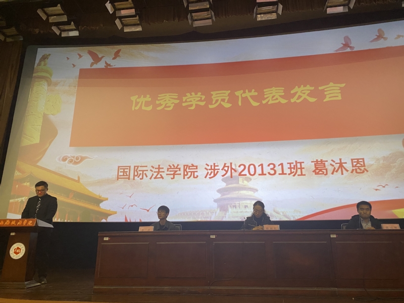李洋宣读了培训班优秀学员名单,国际法学院涉外20131班的葛沐恩同学作为优秀学员代表发言。