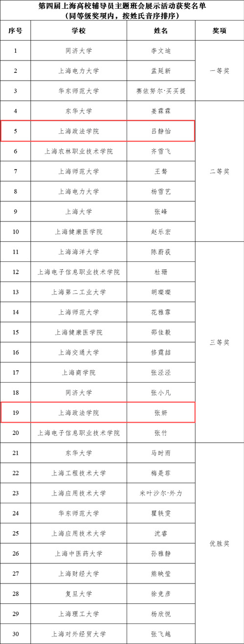 7月5日,第四届上海高校辅导员主题班会展示活动获奖名单公布,我校政府管理学院专职辅导员吕静怡获得二等奖,国际法学院专职辅导员张妍获得三等奖。