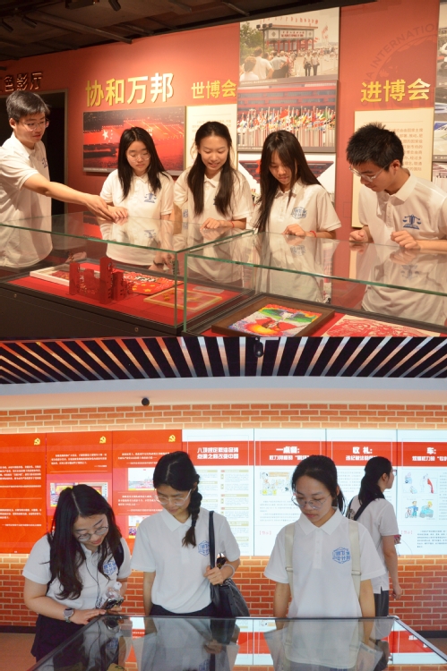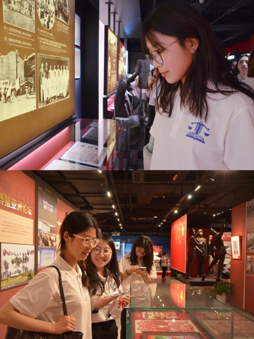 序厅以沉浸式设计和多媒体互动呈现了中共四大召开的历史背景和重要意义。在观看介绍中共四大召开前后史实的视频后,同学们通过触摸屏、投影等设备深入了解中共四大召开前后的社会环境及党史的发展脉络。主展厅分为“风起云涌”“历史丰碑”“唤起工农”和“红色虹口”四大部分。讲解员系统地向同学们展示了中共四大从筹备到召开的全过程以及会议期间的重要文件和历史事件。国旗教育展示厅分为“国旗诞生”“国旗飘扬”“国旗和我”三大主题展区,讲解员介绍国旗创作背后的故事及国旗在新时代的意义,同步解析国旗法、国徽法与宪法精神的内在关联,引导同学们深刻体会到国旗象征的法治精神力量。