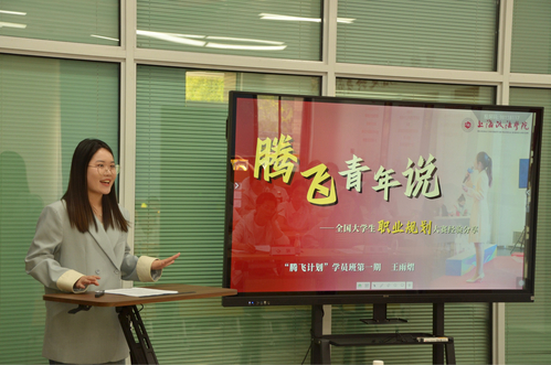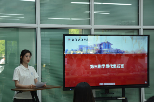 学员班班主任颜涵在发言中鼓励同学们静下心求知,躬下身实践,沉住气磨砺,希望学员们能够持之以恒的学习,同时注重知识转化和应用能力,积极开拓创新,成为上政青年朋辈引领的闪亮名片。“腾飞计划”第一期学员代表、来自的上海纪录片学院的王雨熠同学以“纪时尘风雨,望熠熠人心——做一名讲好新时代中国故事的纪录片编导”为主题,分享其全国大学生职业规划大赛的参赛心得及经验收获,希望新一期学员能够勇敢挑战、不断探索,让“腾飞”故事越来越精彩。