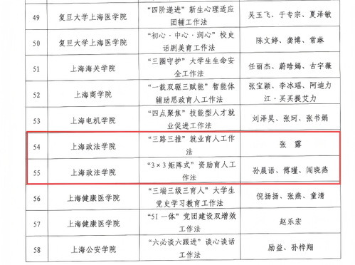 近日,《中共上海市教育卫生工作委员会上海市教育委员会关于公布2024年上海高校辅导员特色工作法名单的通知》(沪教委德〔2025〕11号)中正式公布2024年度上海高校辅导员特色工作法名单。经学校推荐、材料审核、专家评审等环节,我校法律学院专职辅导员、“行路有光”生涯发展工作室负责人张露撰写的《“三路三推”就业育人工作法》和政府管理学院专职辅导员、“思源·星火”工作室负责人撰写的《“3×3矩阵式”资助育人工作法》成功入选。
