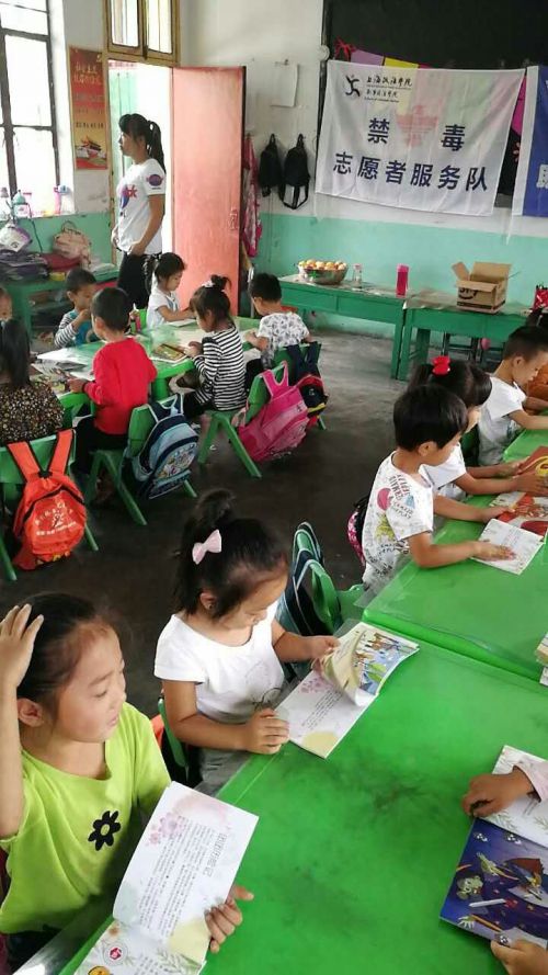 活动过程中,先由志愿者向幼儿园和小学的学生们进行了简单的禁毒知识科普,让他们初步了解有关毒品的专业知识。随后,志愿者们向学生们发放了由我院学生在专业老师的指导下根据所学禁毒知识,编写的一本浅显易懂的禁毒故事绘本《团团历险记》,绘本通过手绘漫画的形式呈现。由于乡村学校的多媒体设备条件较差,志愿者们与学生们一同朗读绘本中的童话故事并与学生们共同演绎其中的一些片段。绘本阅读以及绘本演绎引发了小朋友们的热烈反响,博得阵阵掌声和和欢呼声。