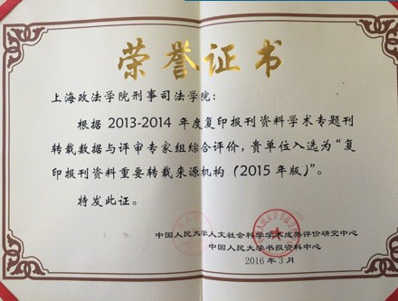 刑事司法学院成功入选“复印报刊资料重要转载来源机构(2015年版)”。法学专业共有57家高等院校所属机构入选,其中上海八家。华东政法大学共有五个学院入选(法律学院、金融法律学院、国际法学院、经济法学院、科学研究院),另三个入选学院是上海交大凯原法学院、上海财大法学院和新利18官方客服刑事司法学院。