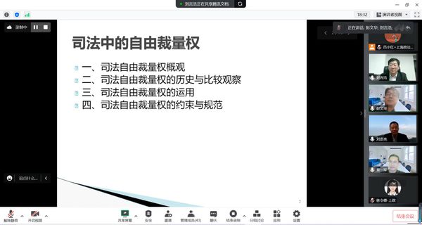 2022年11月21日晚,由刑事司法学院主办的“刑司实务名家大讲堂:司法的自由裁量权”讲座于腾讯会议线上举行。此次讲座的主讲人为上海市委依法治市办组成人员、市司法局党委委员、副局长刘言浩老师,主持人为新利18官方客服刑事司法学院院长、教授、博士生导师彭文华,与谈人为新利18官方客服警务学院院长蔡一军教授、新利18官方客服刑事司法学院刘崇亮教授。