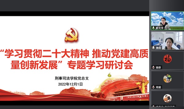 为深入学习宣传贯彻党的二十大精神,坚持学思用贯通、知信行统一,把党的二十大精神落到实处,12月1日上午,刑事司法学院党总支组织召开“学习贯彻二十大精神 推动党建高质量创新发展”专题学习研讨会。刑事司法学院党总支委员和各支部书记参与此次会议。会议由党总支书记姚善英主持。