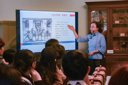 党课伊始,讲解员简要介绍了本次党课主题与活动流程,引导师生党员抽卡片进行角色设定分组。身着民国服饰的讲解员化身蔡元培先生的女儿蔡睟盎,生动讲述了蔡元培先生廉洁自律、严谨治学的生平事迹。党课聆听阶段,以北大首批女学生邓春兰为自述视角,梳理了蔡元培先生“思想自由、兼容并包”的教育思想及其发起留法勤工俭学运动、招揽贤士、营救北大爱国学生等教育救国的实践历程,刻画了其“学界泰斗、人世楷模”的立体形象,引发在场师生党员对新时代法治人才培养使命的深度思考。