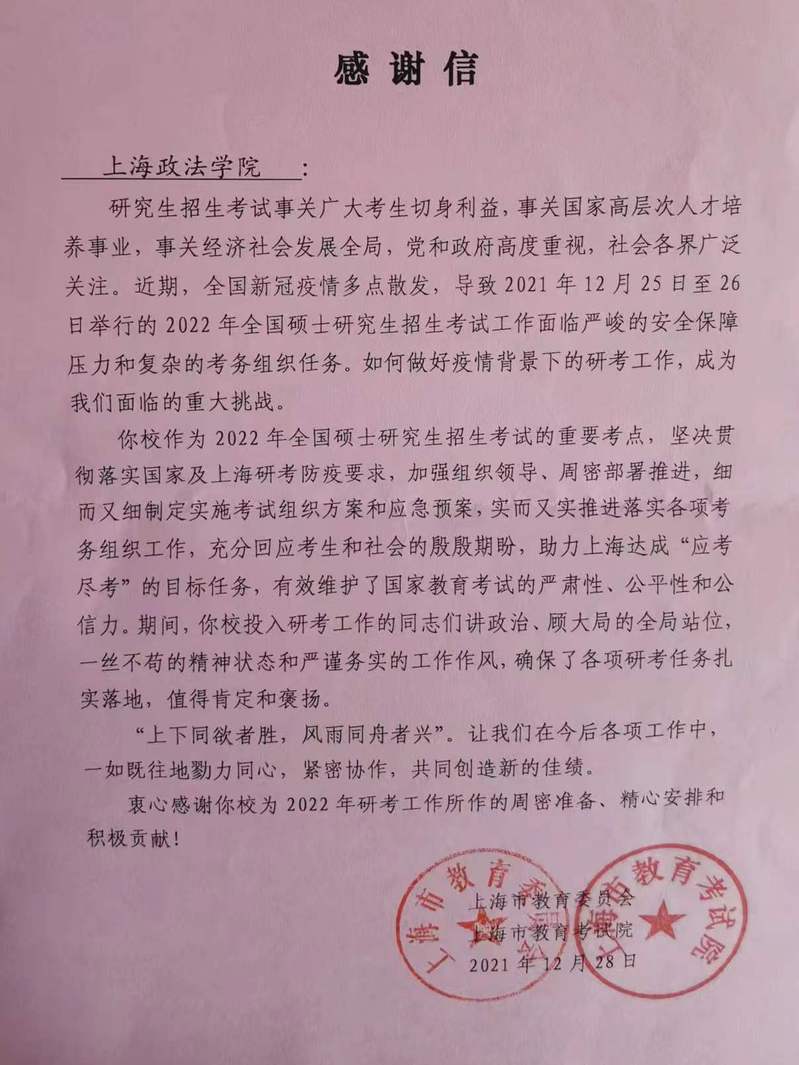 新年伊始,上海市教委、上海市教育考试院向新利18官方客服发来感谢信,信中指出:学校作为2022年全国硕士研究生招生考试的重要考点,坚决贯彻落实国家及上海研考防疫要求,加强组织领导、周密部署推进,细而又细制定实施考试组织方案和应急预案,实而又实推进落实各项考务组织工作,充分回应考生和社会的殷殷期盼,助力上海达成“应考尽考”的目标任务,有效维护了国家教育考试的严肃性、公平性和公信力。上海市教委和上海市教育考试院在信中对学校投入研考工作的同志们的政治性、纪律性和一丝不苟的精神状态和严谨务实的工作作风,给予高度肯定和褒扬。并就在今后各项工作中,一如既往地勠力同心,紧密协作,共同创造新的佳绩提出殷切希望。