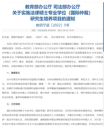 近期,教育部办公厅、司法部办公厅联合印发《关于实施法律硕士专业学位(国际仲裁)研究生培养项目的通知》(教研厅函〔2022〕5号),选取全国20所高校承担这一新型培养项目,我校名列其中。这是继2021年法律硕士专业学位(涉外律师)研究生培养项目后,我校再度承担的重要研究生培养项目。