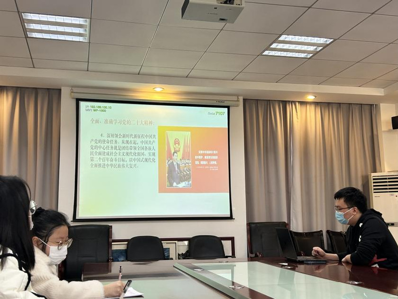 会议伊始,研究生处党支部书记与政府管理学院上政第33学生党支部书记分别介绍了各支部的成员概况、党日活动情况及未来计划,增进支部党员彼此了解。随后,大家共同学习了党的二十大会议精神,重点关注了党的二十大会议报告的学习要点,并集体观看了专题党课《二十大精神二十人讲——第一讲:政治宣言》,对党的二十大报告有了更深刻的理解。