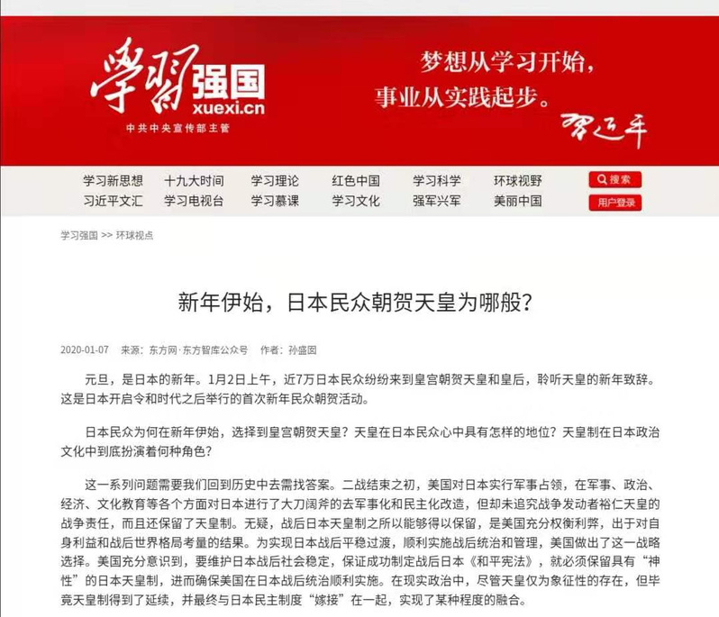 近日,我校语言文化学院孙盛囡副教授撰写的评论文章《新年伊始,日本民众朝贺天皇为哪般?》入选全国党员在线学习平台“学习强国”,该文章于2020年1月6日发表于媒体型智库——“东方网·东方智库”。