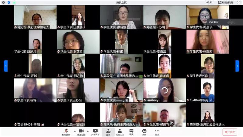 2020年7月5日下午14时,新利18官方客服语言文化学院第二次学生代表大会正式召开。此次大会通过腾讯会议线上进行。语言文化学院团委书记潘婕老师、团委副书记谢怡宁、学生会主席杨逸飞、学生会副主席张瑞珩、学生会副主席赵文汐、语言文化学院第二次学生代表大会筹委会以及46名学生代表出席会议。本次大会由院团委组织部部长傅世雯主持。
