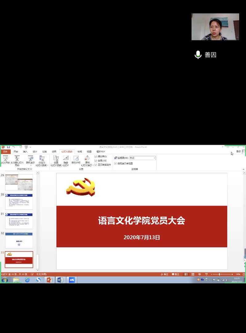 7月13日上午,语言文化学院党总支线上召开党员大会。全体教师党员参加,会议由党总支书记姚善英主持。