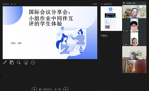 活动中,沈燕老师分享了参加“ICFULL 2025 & GloCALL 2025”国际研讨会的参会的体会与前沿洞见,特别聚焦于国际学界在同伴互评领域的最新研究动态与实践案例。分享引发了教研室同事们的高度兴趣和热烈讨论。大家结合自身教学实践,就如何优化小组作业中的同伴互评机制、提升其信效度、以及更好地关注和利用学生体验以改进教学效果等具体问题展开了深入交流。