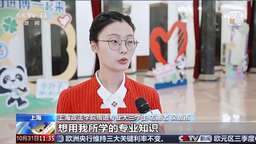 此外,来自学院23级俄语专业的“二年级小叶子”吴思雨则讲述了自己以专业所长助力盛会的实践故事,接受央视新闻和上海教育电视台采访。