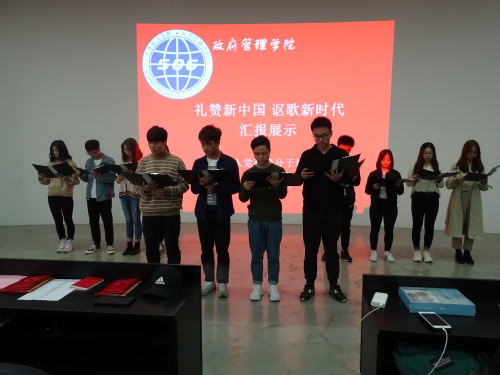 然后,各小组分别以合唱、乐器演奏、朗诵等形式进行了“礼赞新中国,讴歌新时代”主题汇报演出,以饱满的热情高唱红歌、诵读红色诗词。